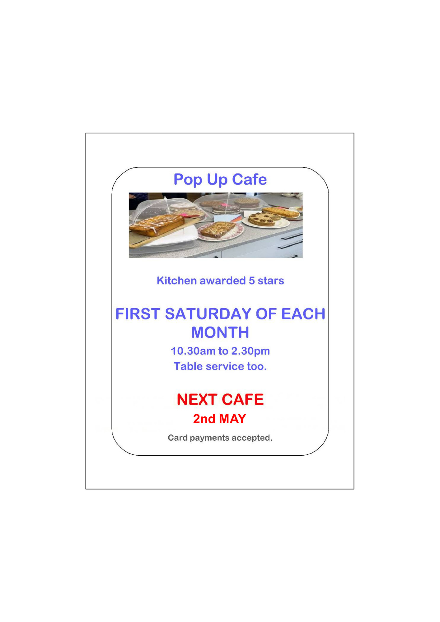 Our Pop-up Cafe will be open on the first Saturday of each month, Just Drop In Enjoy friendly company and "be waited on" in the warmth of the Village Hall. Be seeing you ?